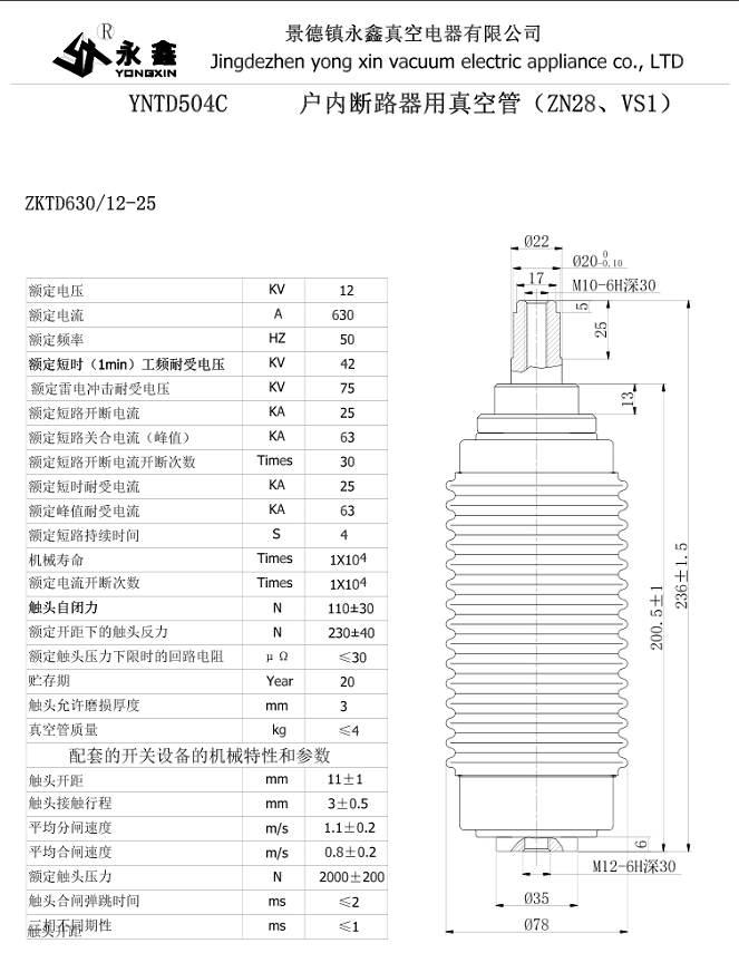 YNTD504C戶內(nèi)斷路器用真空管(ZN28、VS1-C型)