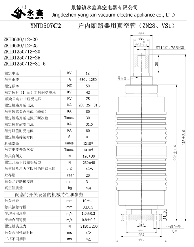 YNTD507C2戶內(nèi)斷路器用真空管(ZN28、VS1-G2型)