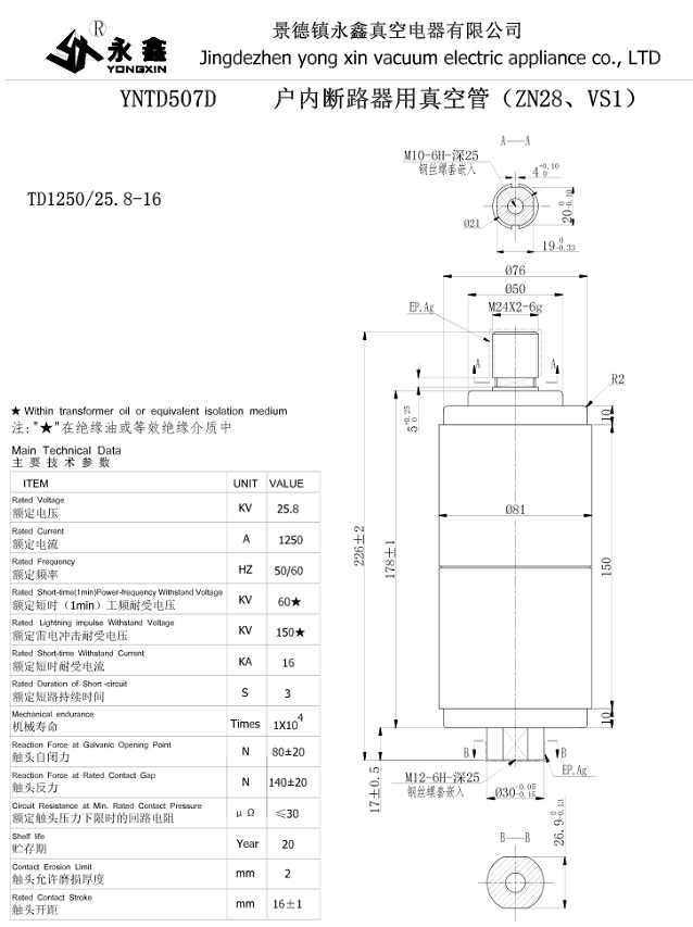YNTD507D戶內斷路器用真空管(ZN28、VS1-H型)出口型