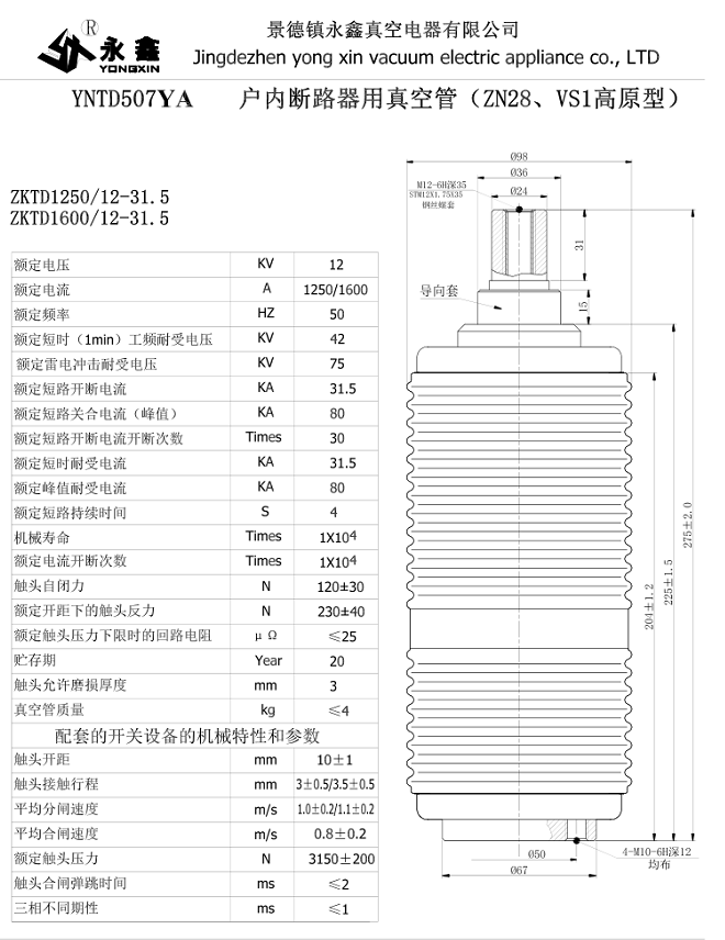 YNTD507YA戶內(nèi)斷路器用真空管(ZN28、VS1-A型)