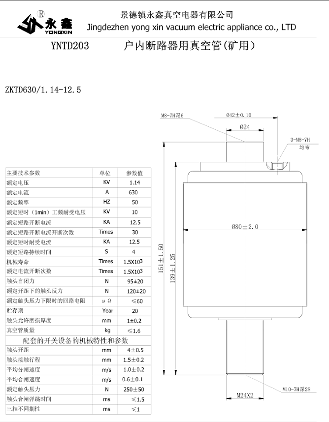 YNTD203戶內(nèi)斷路器用真空管630-12.5