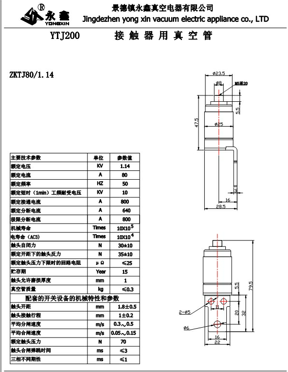 YTJ200接觸器用真空管80-1.14