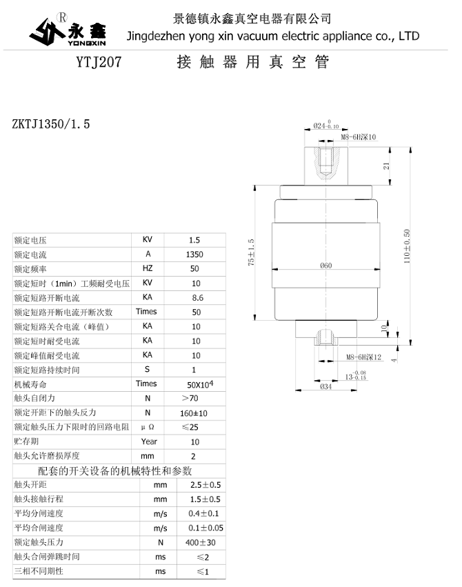 YTJ207接觸器用真空管1350-1.5